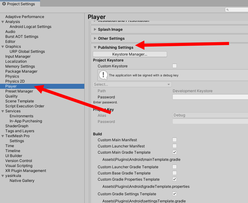 3)유니티의 프로젝트 설정(project settings)에서 player의 publishing settings로 이동합니다.