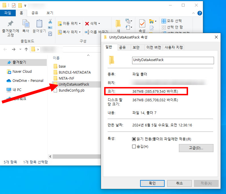 8)UnityDataAssetPack 폴더의 크기를 확인합니다. split application binary는 base 모듈에서 에셋 팩 데이터를 분리하여 결과적으로 base 모듈의 크기가 감소합니다.
