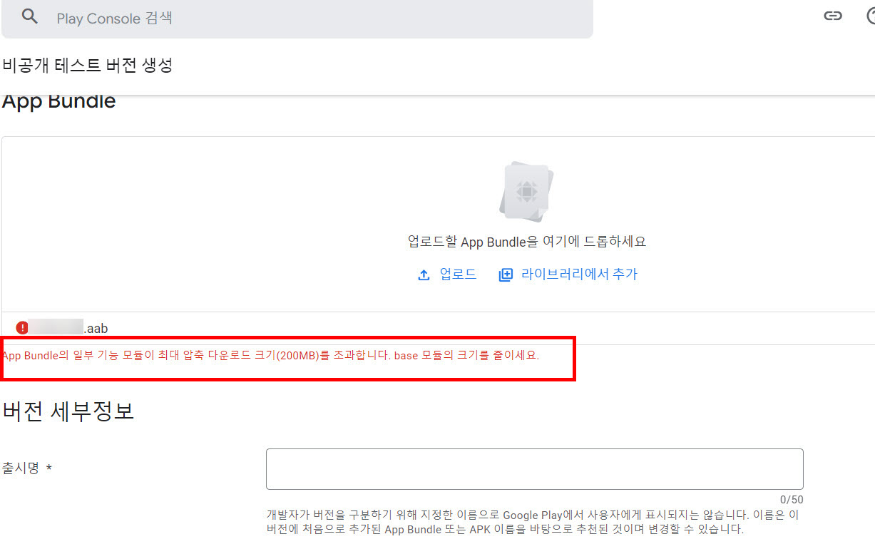 app bundle의 일부 기능 모듈이 최대 압축 다운로드 크기(200MB)를 초과합니다. base 모듈의 크기를 줄이세요.