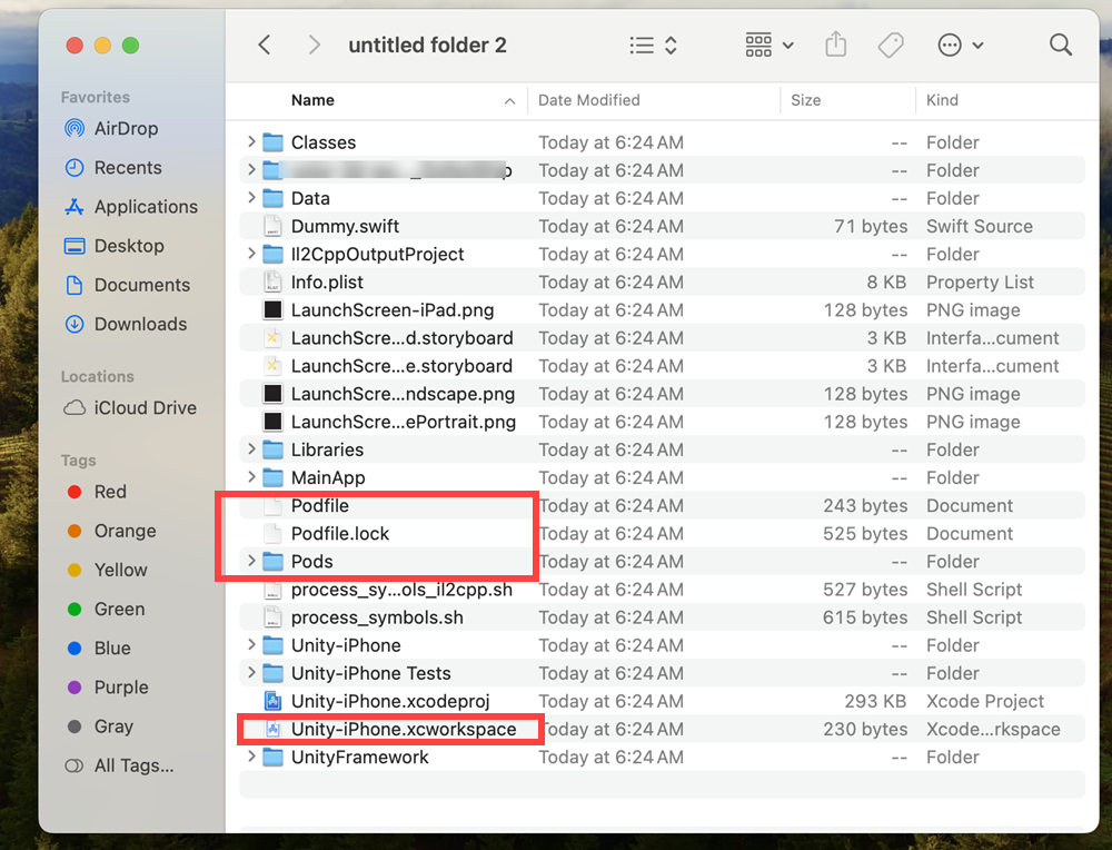 일반적으로 유니티(macOS)에서 CocoaPods 설치를 진행할수있으며 빌드한 결과 Xcode 프로젝트에 Workspace파일이 포함됩니다. 만약 유니티에서 CocoaPods 설치를 실패하면 터미널을 사용하여 CocoaPods를 설치해야합니다. CocoaPods 설치를 완료하면 유니티에서 생성한 Xcode 프로젝트에 Workspace 파일이 포함합됩니다.