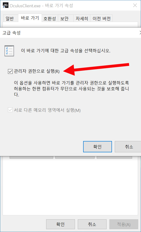3)고급 속성에서 관리자 권한으로 실행에 체크하고 확인합니다.
