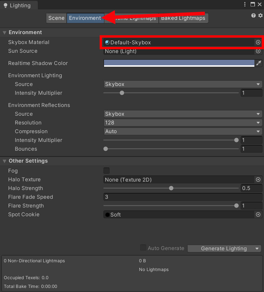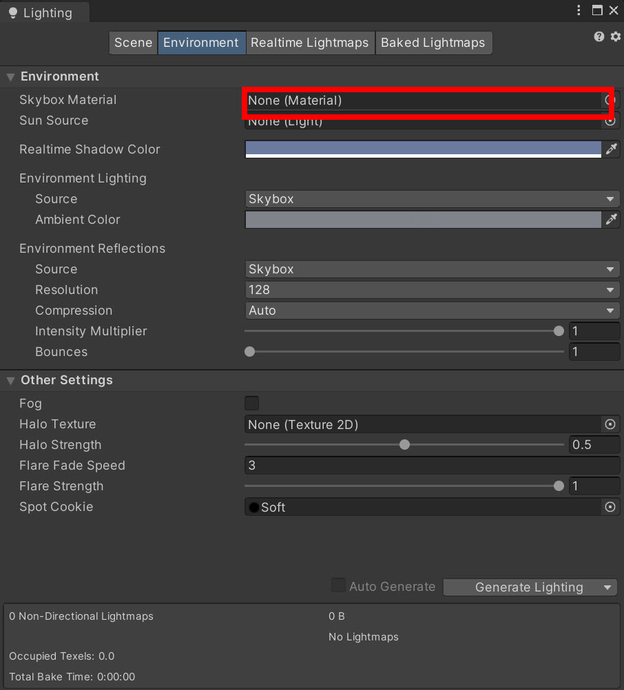 2)lighting의 environment에서 기본 설정된 skybox 재질을 제거합니다.