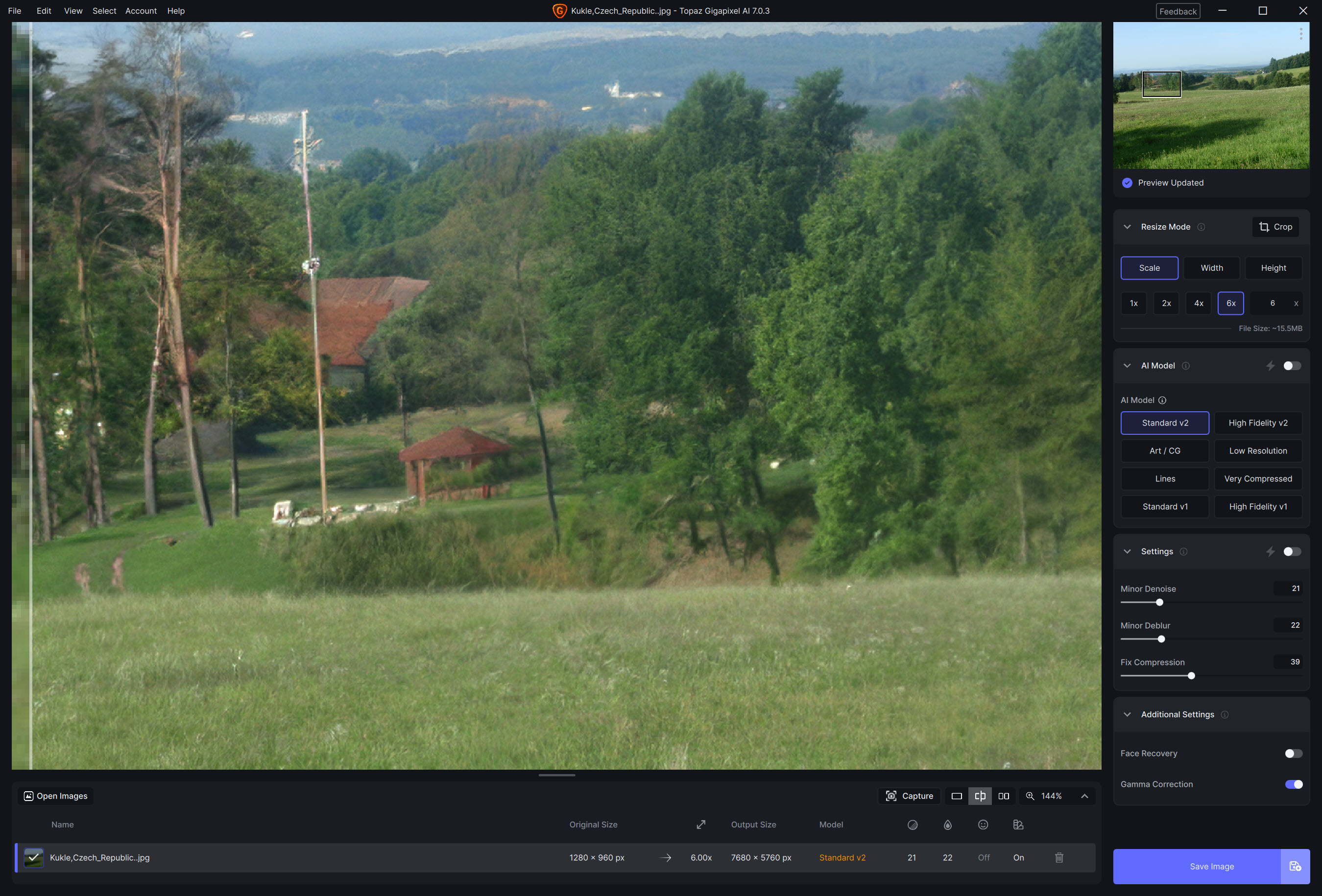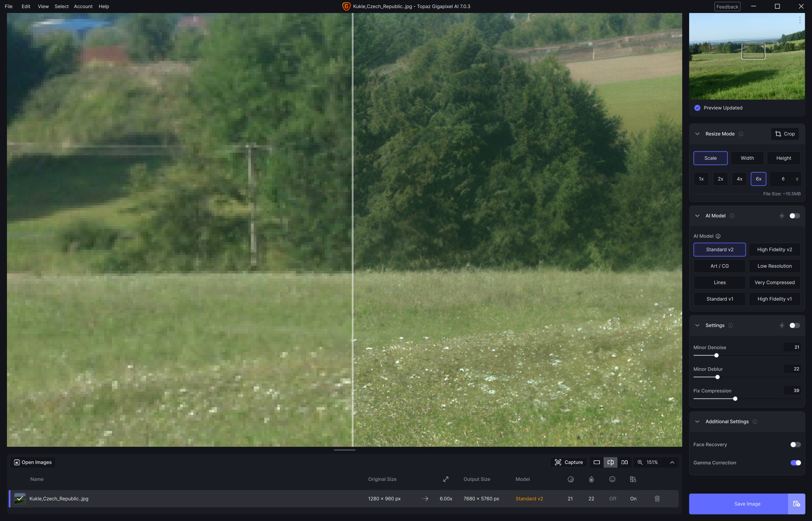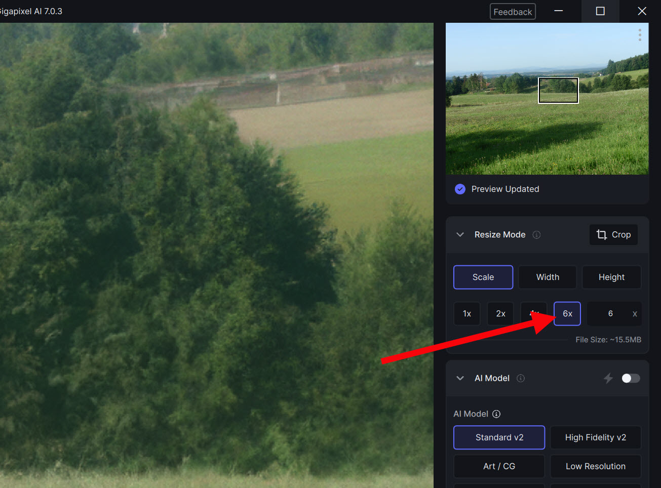 5)우측에서 결과 이미지의 스케일을 설정합니다. 6x를 선택하면 원본 이미지를 6배 확대하고 화질을 개선합니다.