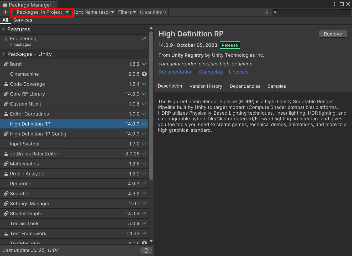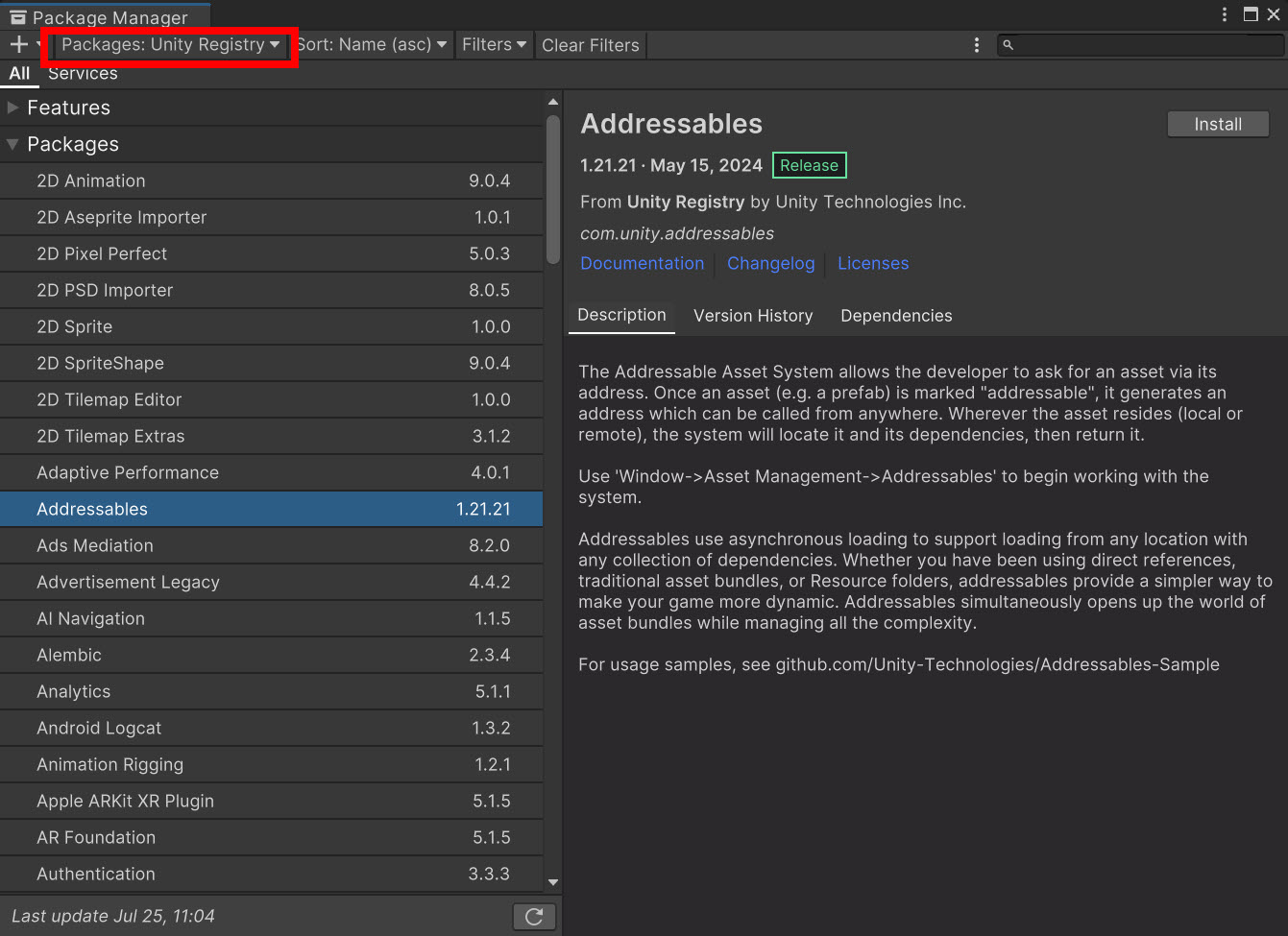 유니티 레지스트리의 패키지 목록(Packages: Unity Registry)