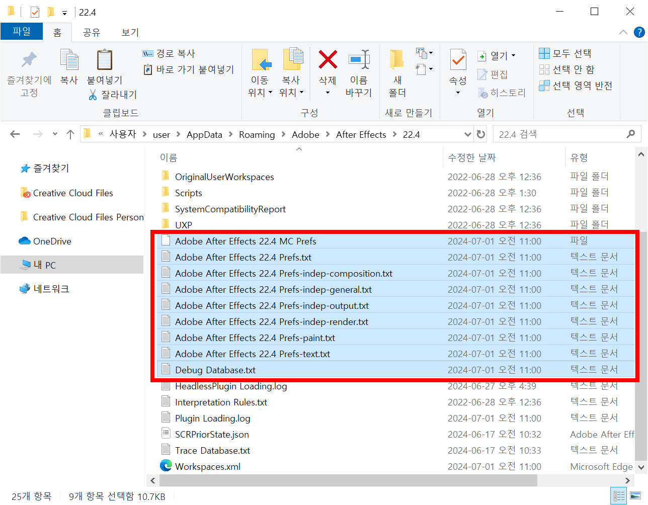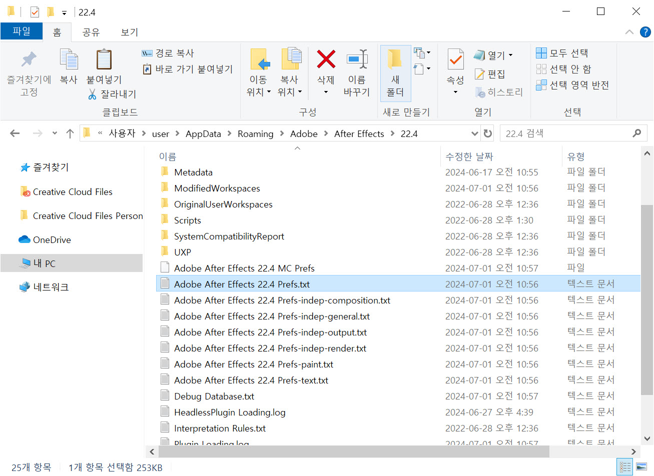 3)환경설정 파일을 선택 및 제거합니다. 에프터이펙트를 재실행하면 새로운 환경 설정 파일을 생성합니다.