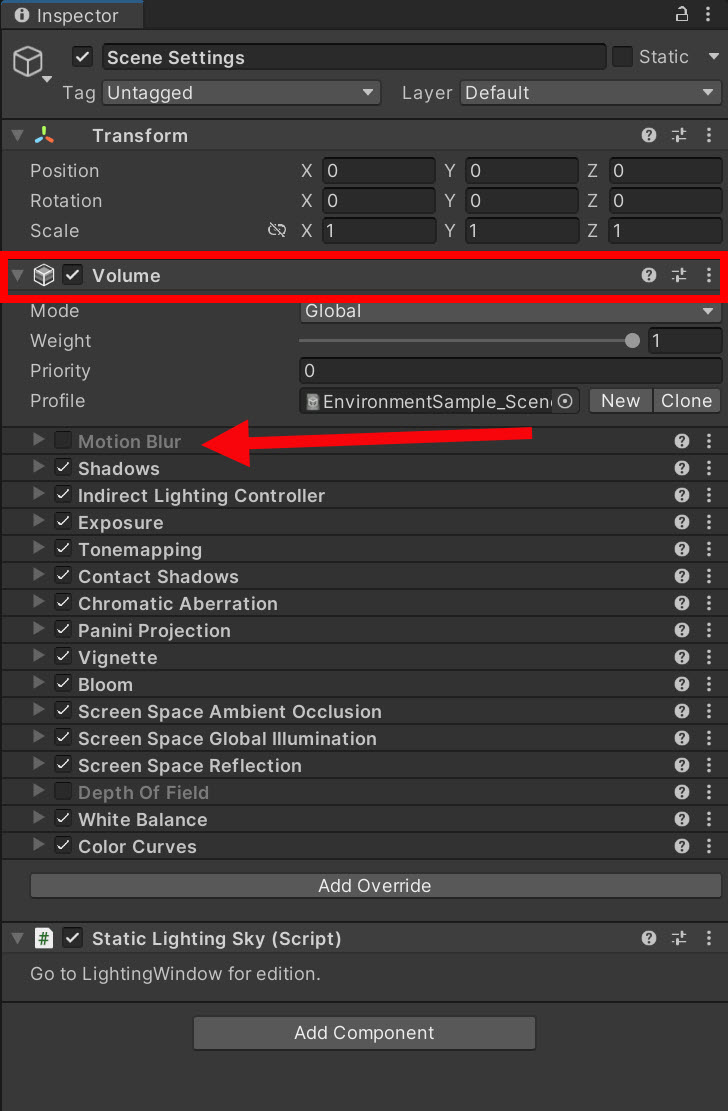 6)씬에 개별적으로 존재하는 볼륨 프로필에서 모션 블러(motion blur)를 체크해제합니다.