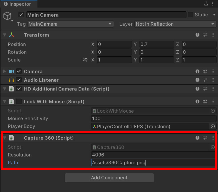 2)예에서 사용자 스크립트 또는 유니티 공식 Recorder를 사용하여 카메라 360 뷰를 캡처합니다.