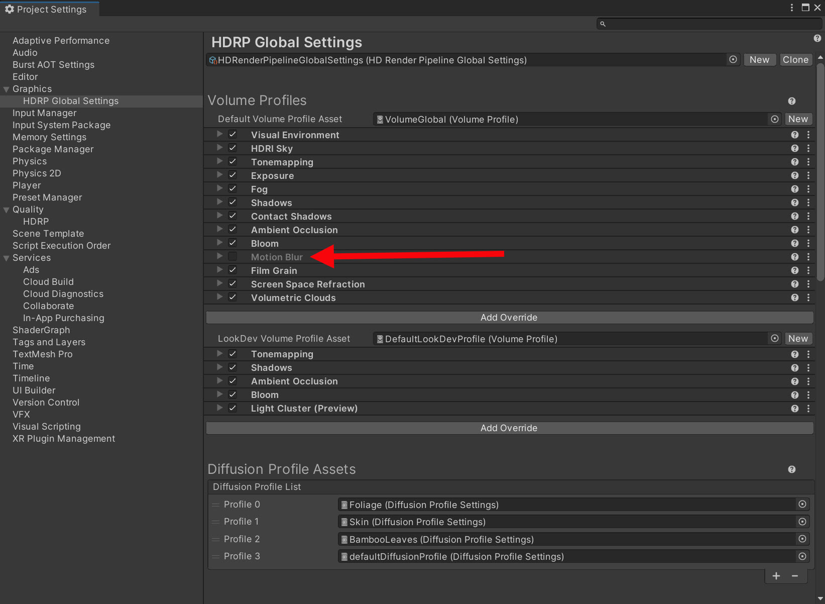 5)프로젝트 전반에 사용중인 볼륨 프로필(volume profiles) 목록에서 모션 블러(motion blur)를 체크해제합니다