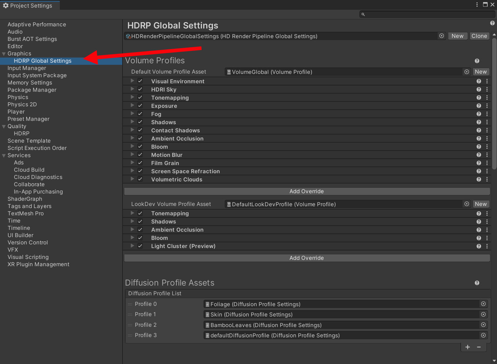 4)프로젝트 설정(project settings)에서 그래픽(graphics) 하위의 HDRP Global Settings로 이동합니다.