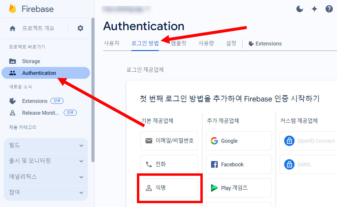 4)파이어베이스 콘솔(firebase console)에서 프로젝트의 인증(Authentication)을 선택하고 로그인 방법의 익명을 선택합니다.