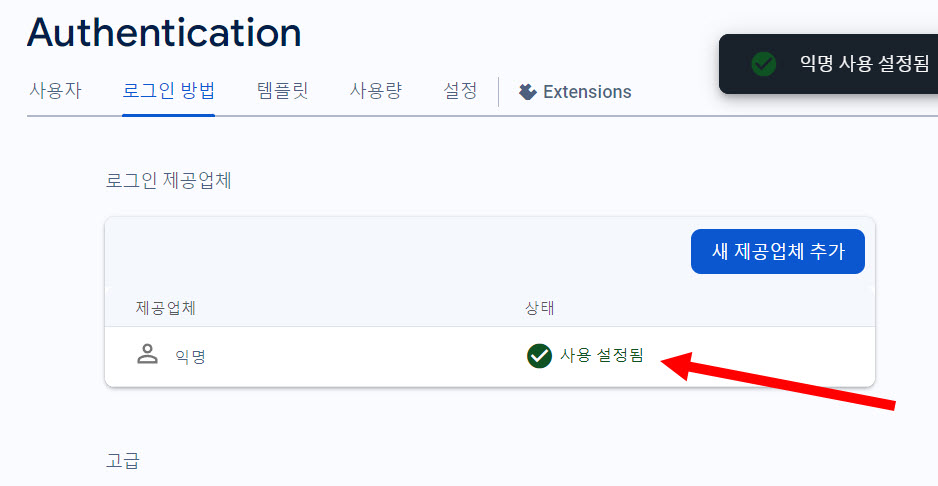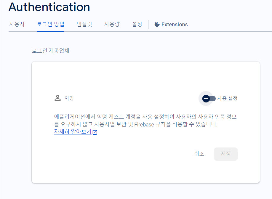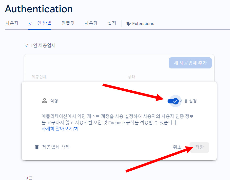 이 설정은 아직 앱에 가입하지 않은 사용자가 Firebase 인증을 사용해 임시적으로 익명 계정을 생성하고 보안 규칙으로 보호받는 데이터를 사용할수있도록합니다.