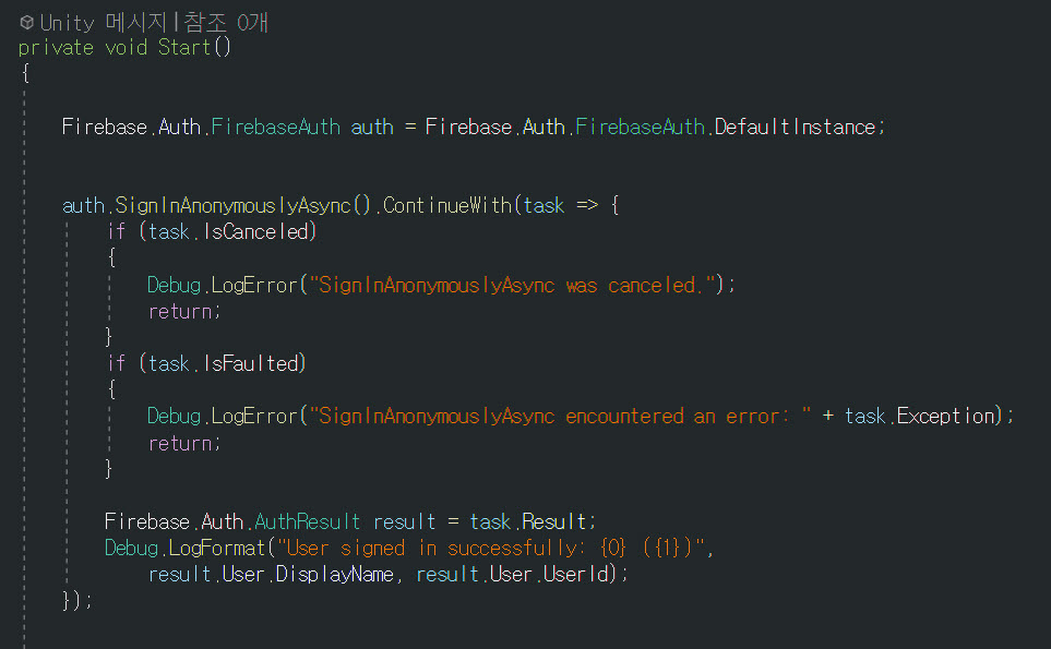 7)사용자를 익명으로 로그인시키려면 다음과 같이 Firebase.Auth.FirebaseAuth.SignInAnonymouslyAsync함수를 호출합니다.