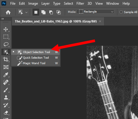 2)좌측에서 오브젝트 선택 도구(object selection tool)를 선택합니다. 오브젝트 선택 도구는 이미지의 주제를 선택할수있는 기능을 제공합니다.