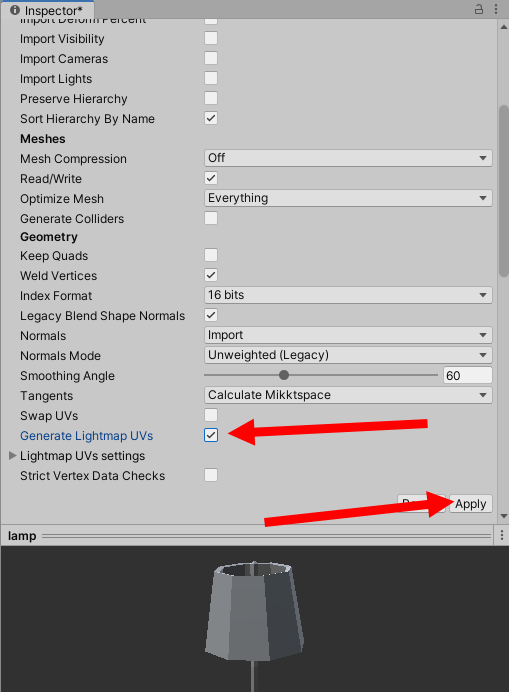 5)모델의 두번째 UV 채널을 생성하려면 모델의 import settings에서 generate lightmap UVs에 체크하고 적용합니다(apply)