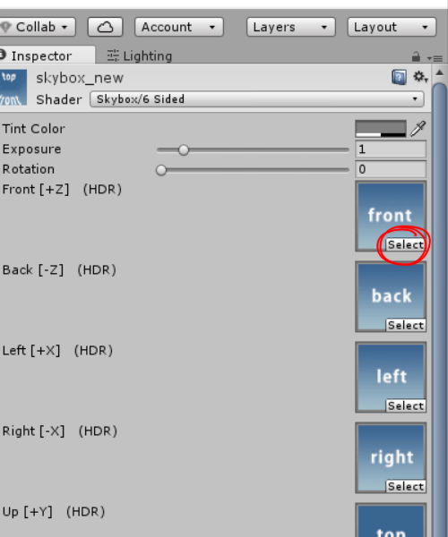 3)스카이박스의 6면에 사용할 이미지의 영역을 설정합니다(top, front, left, back, right, ground)