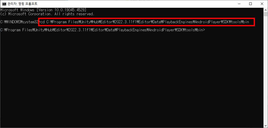 cd C:\Program Files\Unity\Hub\Editor\에디터 버전\Editor\Data\PlaybackEngines\AndroidPlayer\SDK\tools\bin