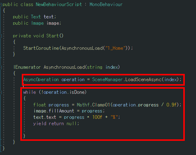 4)비동기 씬 로드를 시작합니다. 씬이 완전히 로드될때까지 작업진행률(progress)을 업데이트하고 이미지와 텍스트에서 이것을 표시합니다. 진행률이 1.0에 도달하고 isDone이 호출되면 작업이 완료되어 씬을 활성화합니다.