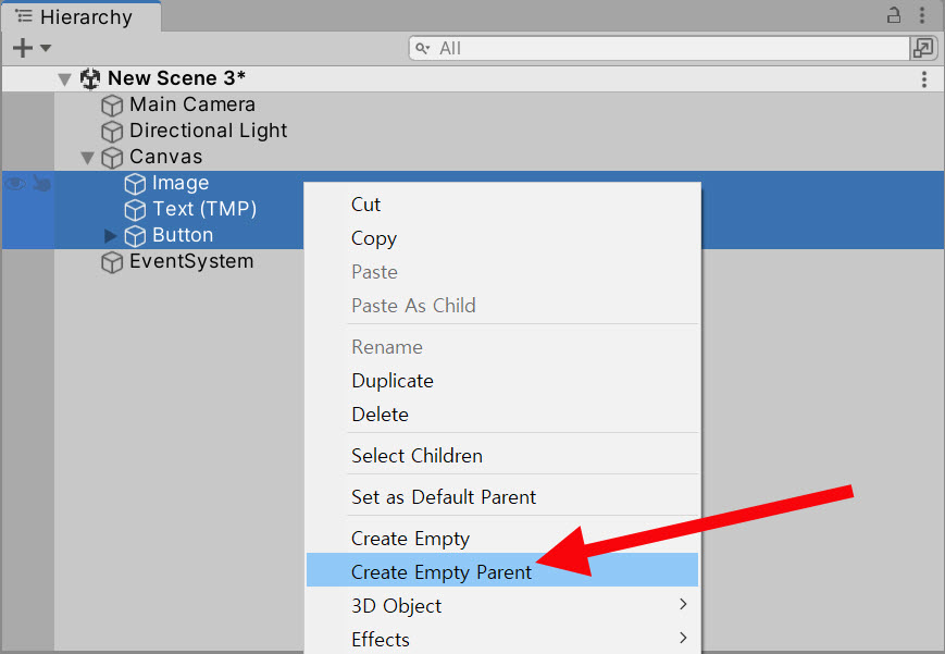 2)일괄적으로 투명도를 설정할 오브젝트들을 선택하고 crate empty parent를 선택합니다.