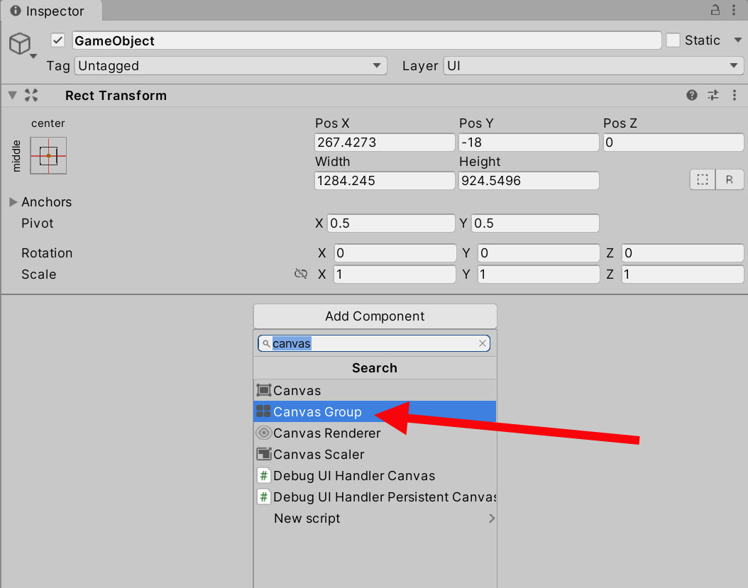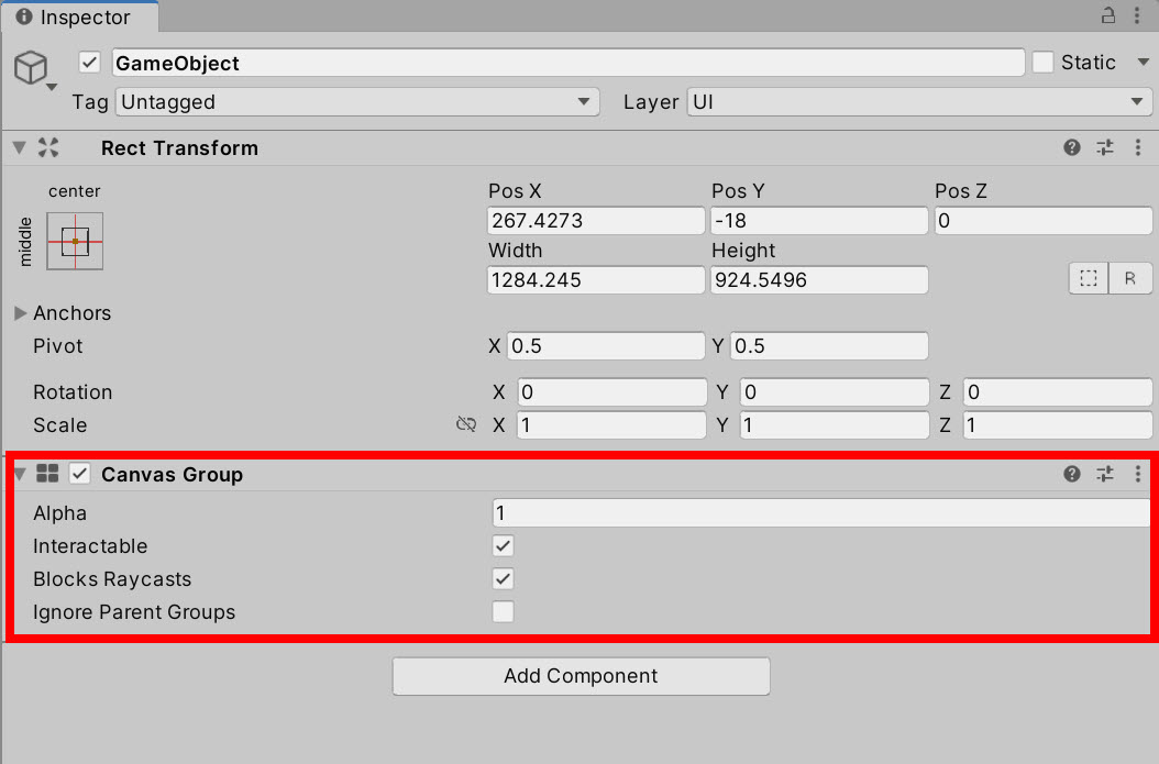4)부모 오브젝트에 캔버스 그룹 컴포넌트를 추가합니다(CanvasGroup)