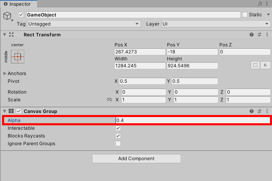 5)캔버스 그룹의 Alpha 수치를 조절하여 캔버스 그룹 하위에 존재하는 오브젝트의 투명도를 설정합니다.