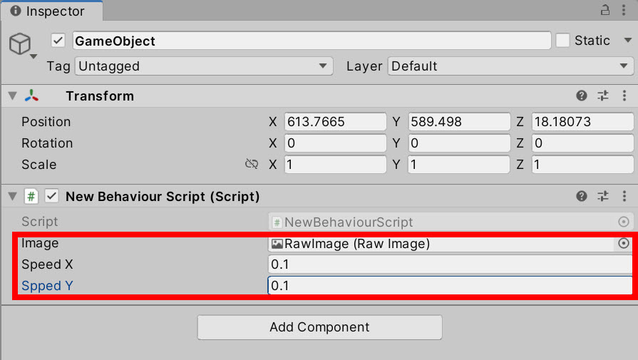 6)RawImage를 참조하고 이동 속도를 설정합니다.