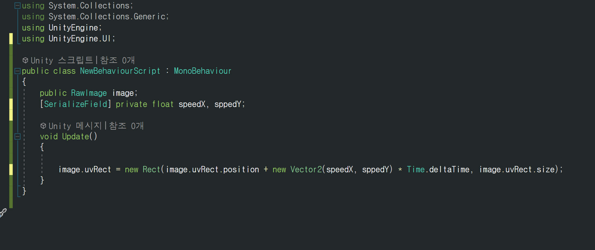 5)새로운 스크립트를 생성하고 아래 코드를 추가합니다. 업데이트 함수에서 RawImage의 텍스처 좌표를 이동합니다.