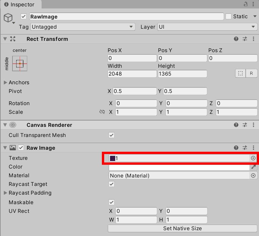 4)Raw Image의 텍스처에 배경 이미지 텍스처를 설정합니다.