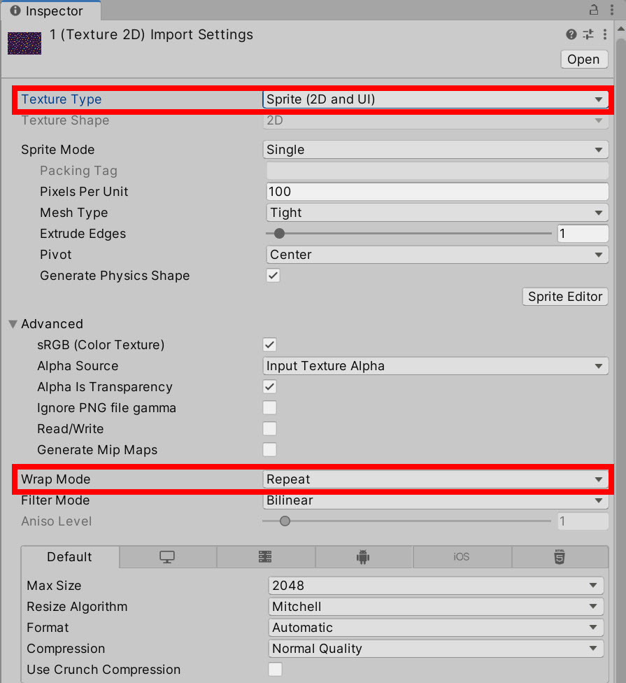 2)이미지 텍스처의 import settings에서 텍스처 타입(Texture Type)의 스프라이트(Sprite)를 선택하고 Wrap Mode의 Repeat를 선택하고 적용합니다.