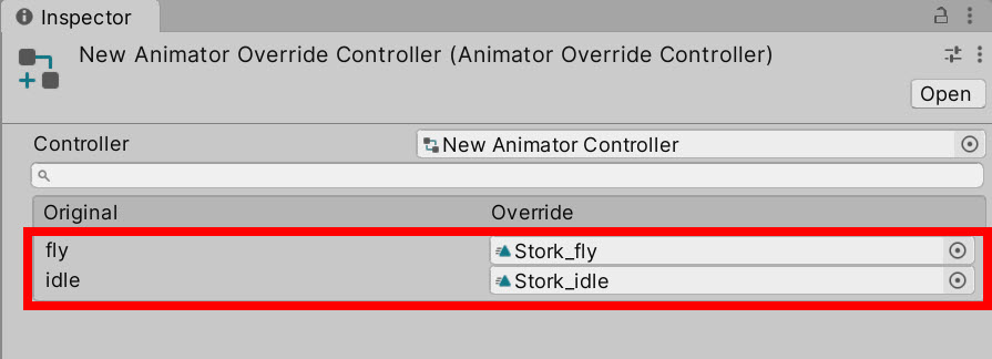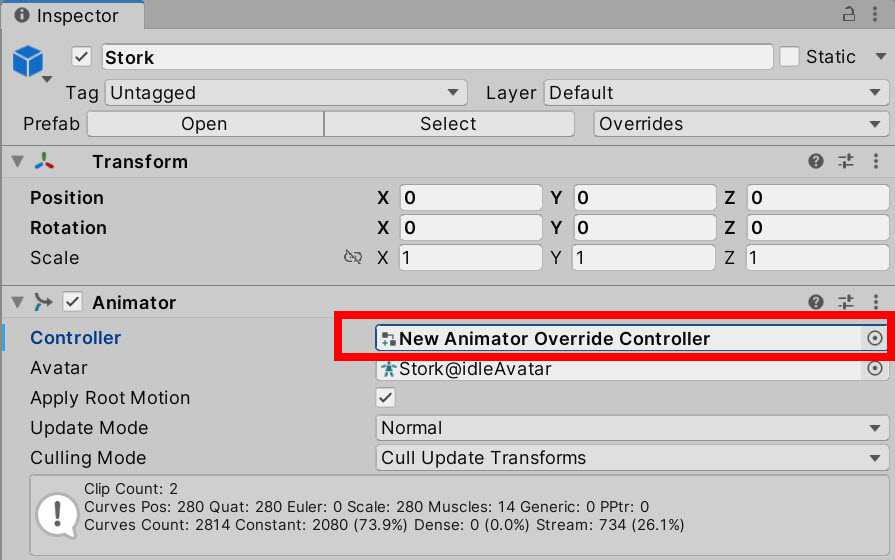 10)애니메이터 오버라이드 컨트롤러를 선택하고 Controller에서 원본 애니메이터 컨트롤러를 참조합니다.