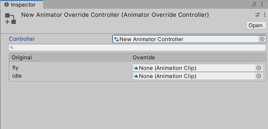 애니메이터 오버라이드 컨트롤러(Animator Override Controller)는 원본 애니메이터 컨트롤러(Animator Controller)와 동일한 구조와 로직을 사용하지만 새롭게 할당된 애니메이션을 플레이합니다.