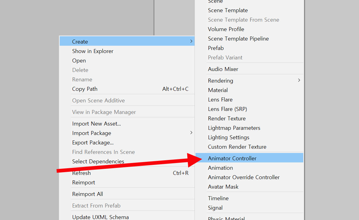 1)애니메이터 컨트롤러(Animator Controller)를 생성합니다.
