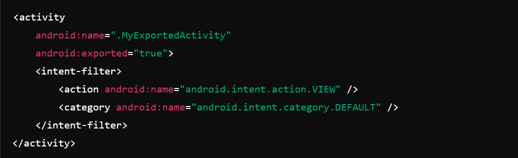 아래 예에서 MyExportedActivity는 외부 앱에서 android.intent.action.VIEW 인텐트를 통해 실행될 수 있습니다.
