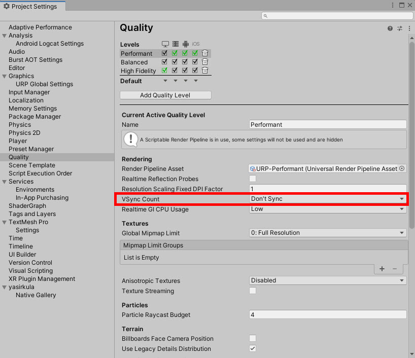 1)프로젝트 설정(project settings)의 quality에서 대상 플래폼의 품질 수준을 선택합니다. 예에서 안드로이드 플래폼의 품질 수준 Performant를 선택합니다.