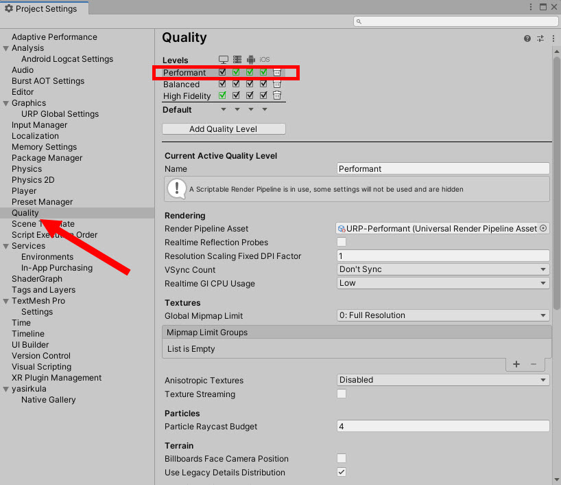 1)프로젝트 설정(project settings)의 quality에서 대상 플래폼의 품질 수준을 선택합니다. 예에서 안드로이드 플래폼의 품질 수준 Performant를 선택합니다.
