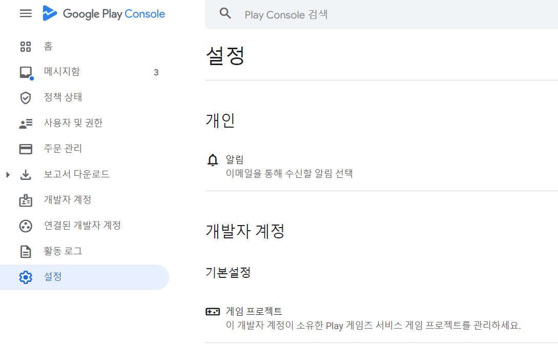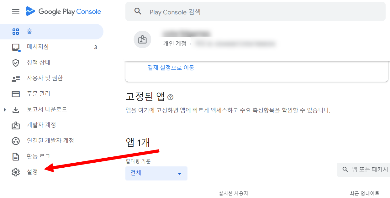 1)구글 플레이 콘솔 웹사이트에서 좌측의 설정 메뉴로 이동합니다.