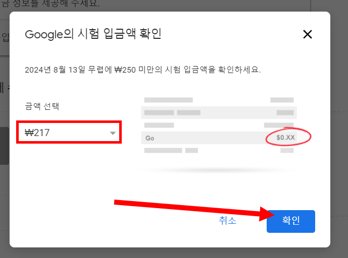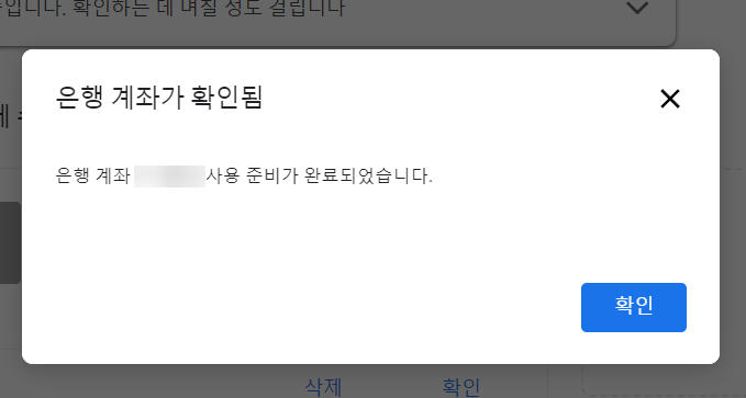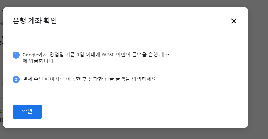6)은행 계좌 확인을 위해 구글에서 $250 미만의 금액을 해당 은행 계좌로 입금합니다(영업일 기준 3일 이내)