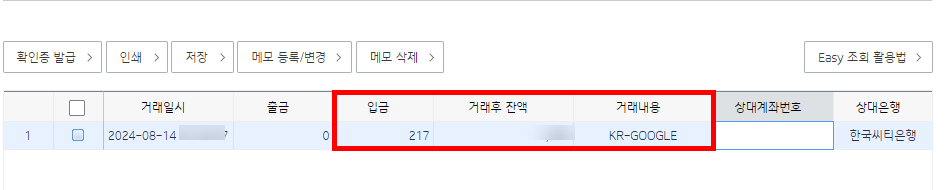 7)영업일 기준 3일 이내에 계좌에서 구글(KR-GOOGLE)이 입금한 금액을 확인할수있습니다.