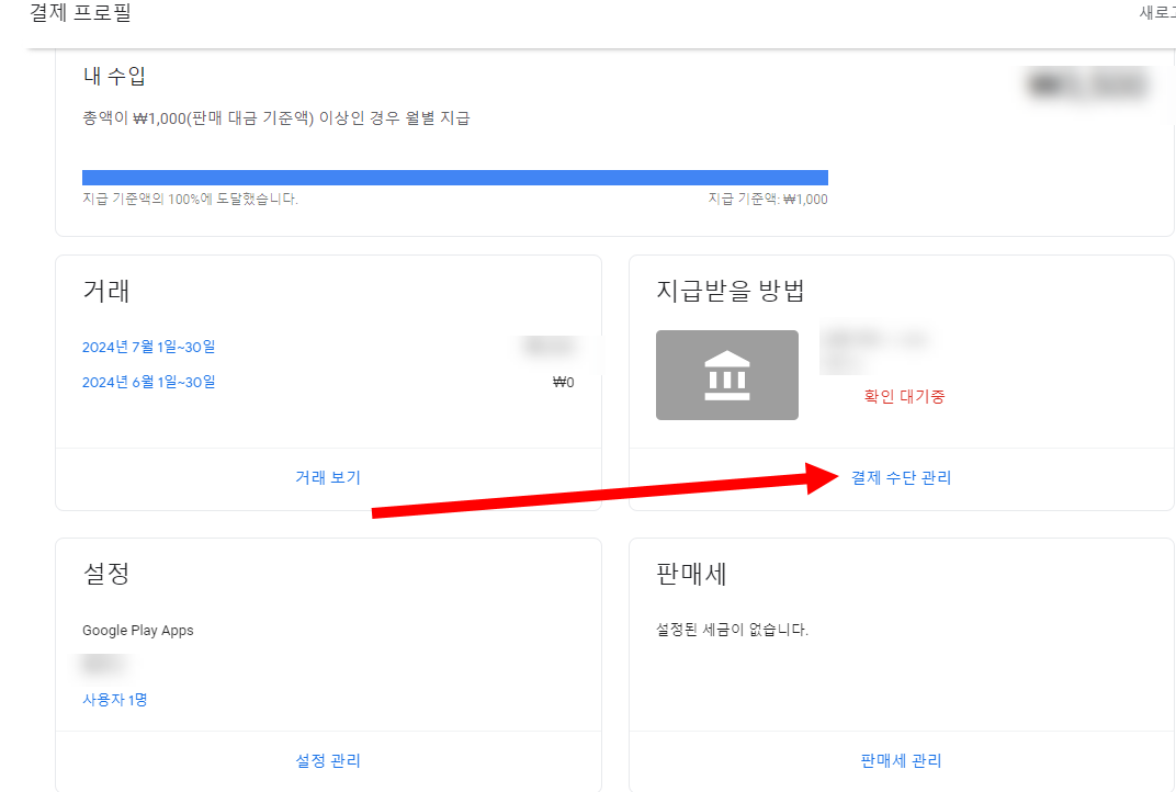 3)지급받을 방법의 결제 수단 관리로 이동합니다.