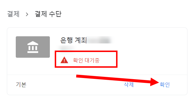 8)구글 플레이 콘솔의 결제 수단에서 해당 은행 계좌 확인 대기중인것을 확인할수있습니다. 확인을 클릭합니다.