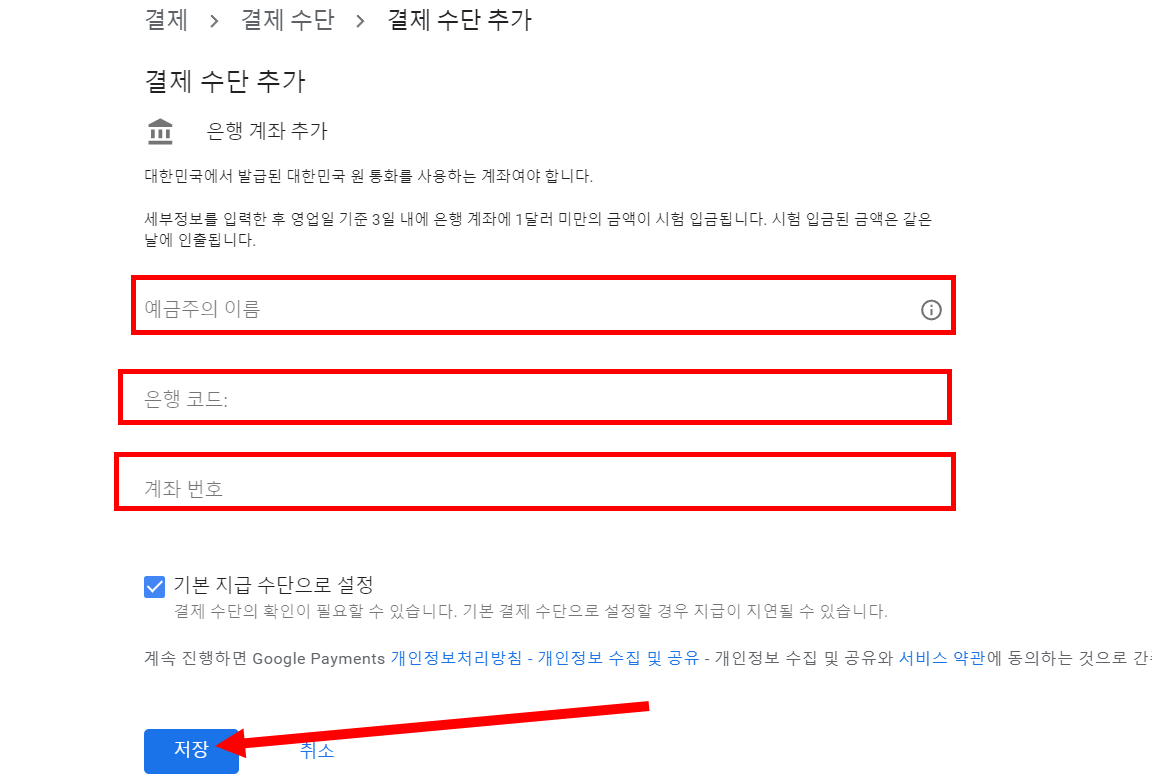 구글 플레이 콘솔(Google Play Console) 결제 프로필에서 결제 수단 추가하기(은행 계좌 추가, 은행 계좌 확인)