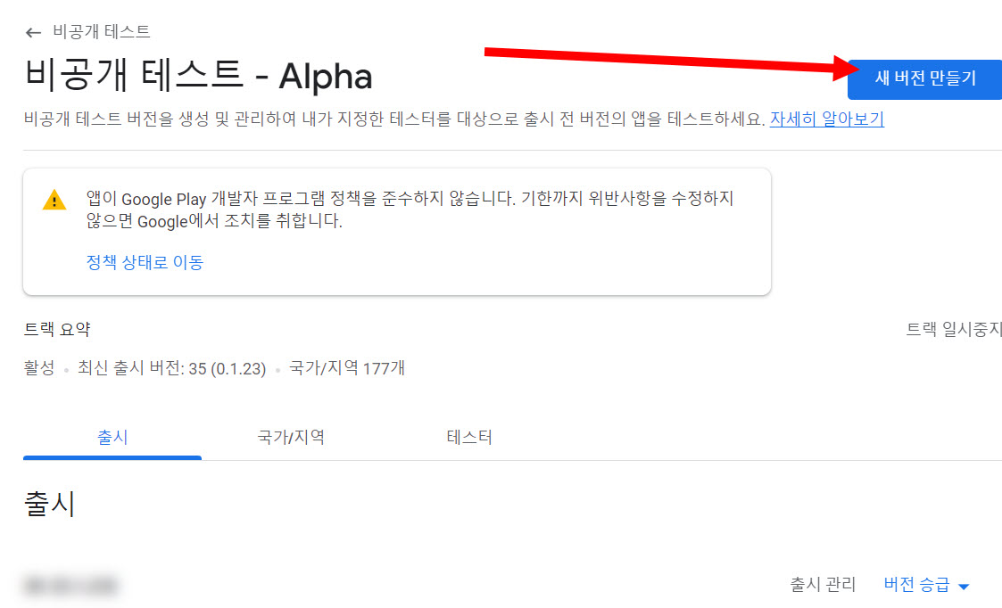 2)비공개 테스트 - alpha 트랙이 생성된것을 확인할수있습니다. 새 버전 만들기를 선택합니다.