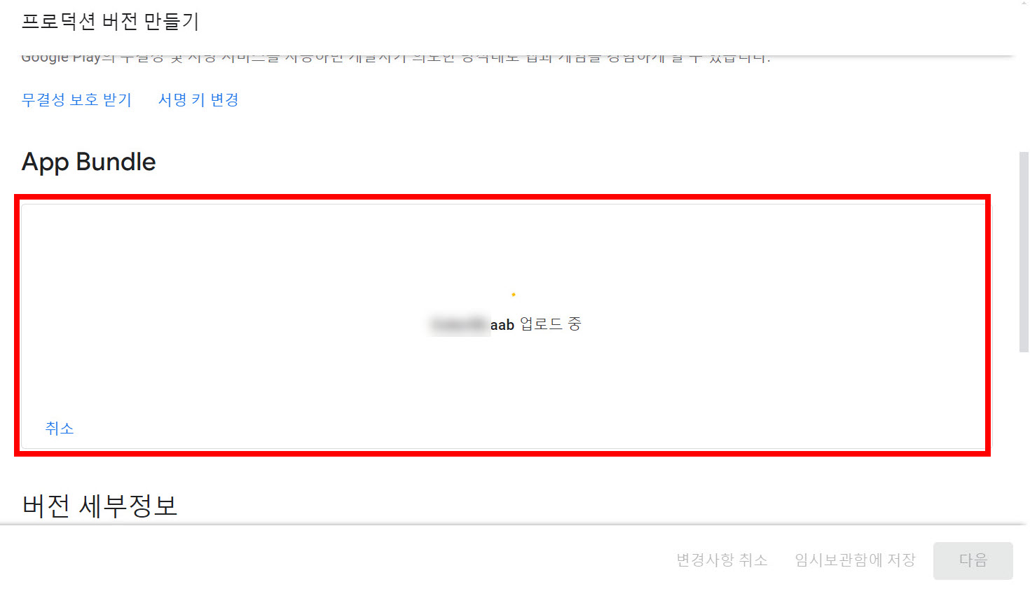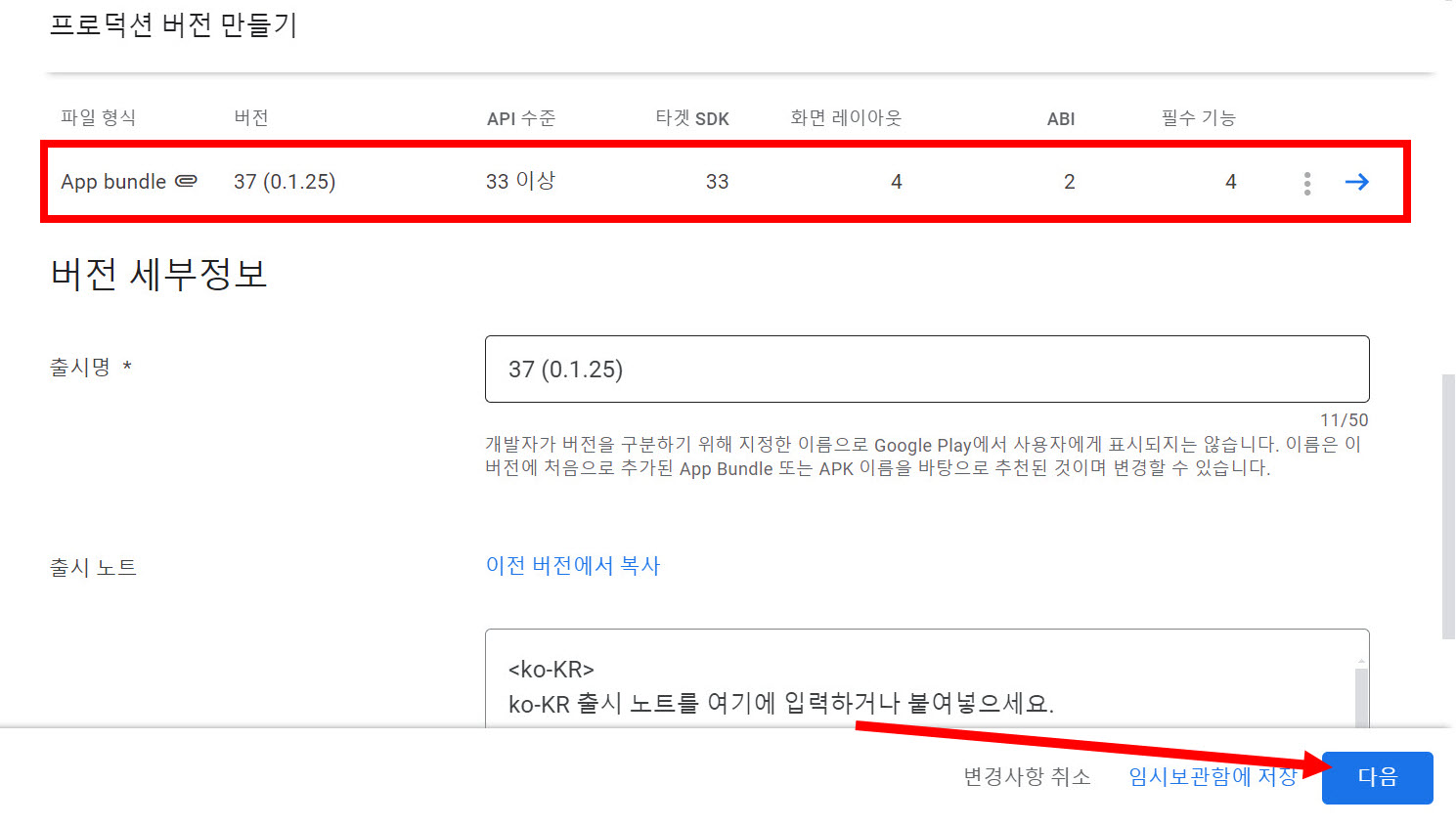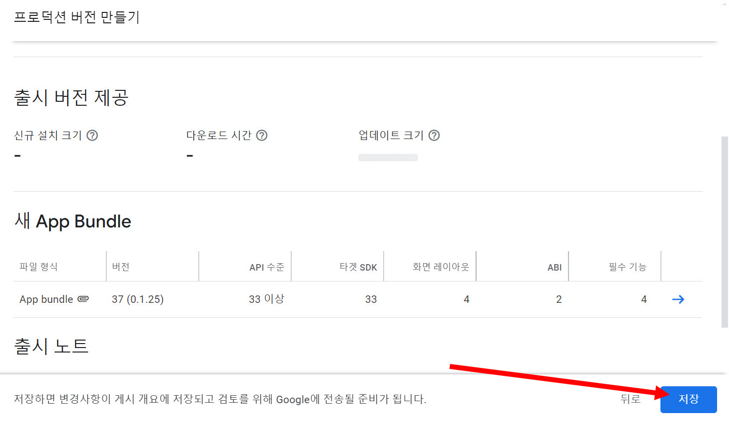 11)업로드한 앱번들을 확인하고 버전 세부 정보를 입력하고 저장합니다.