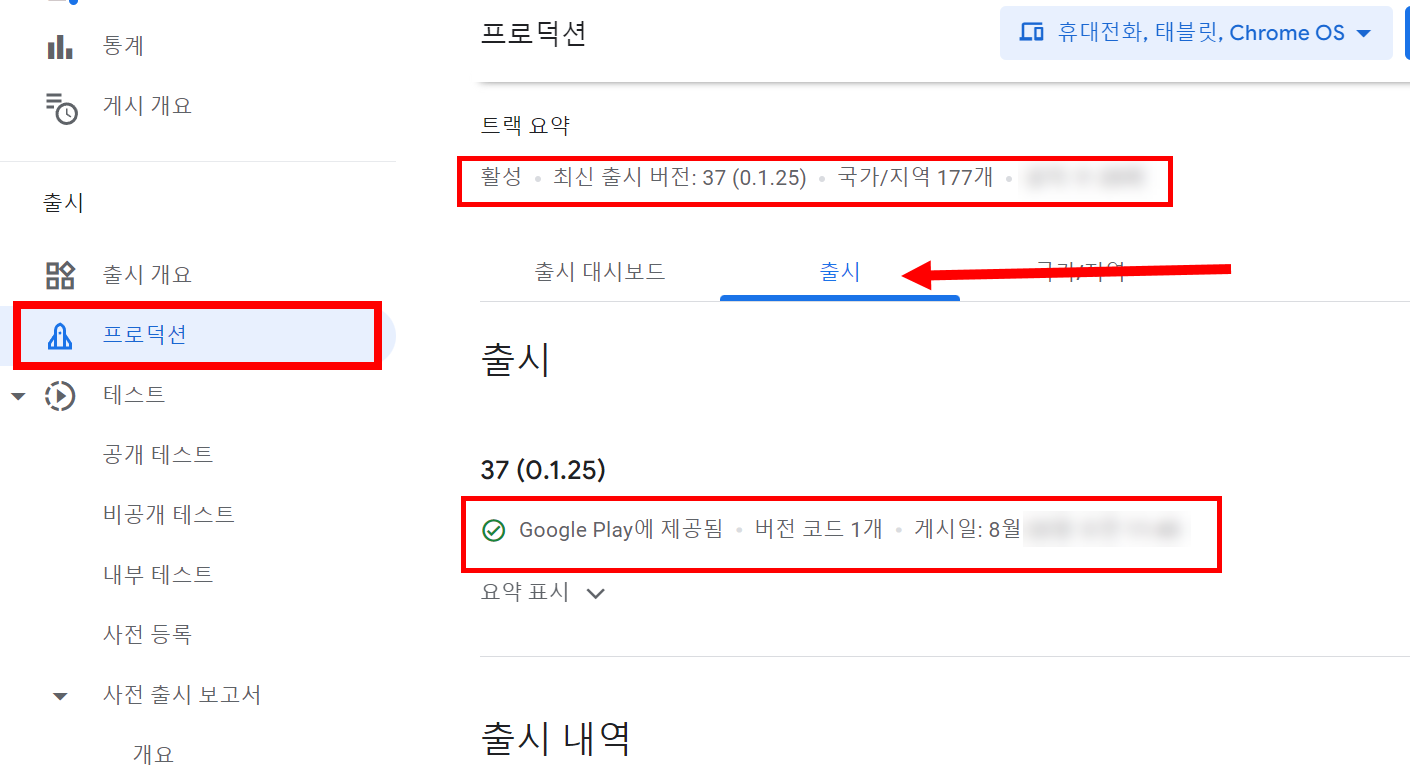 15)구글 플레이 콘솔의 프로덕션에서 프로덕션 트랙이 활성화되고 출시 및 구글플레이(google play)에 제공된것을 확인할수있습니다.