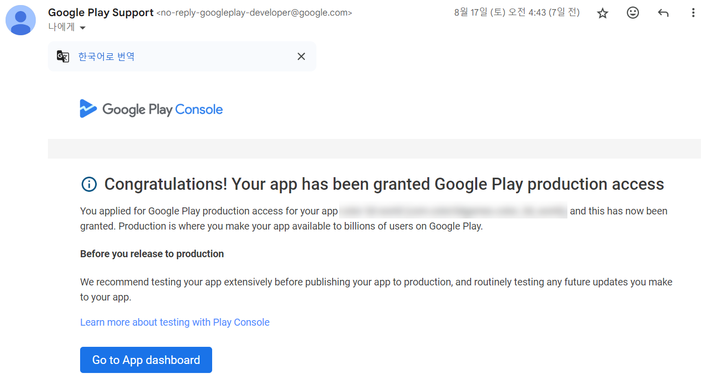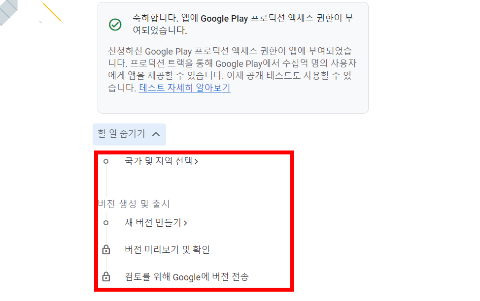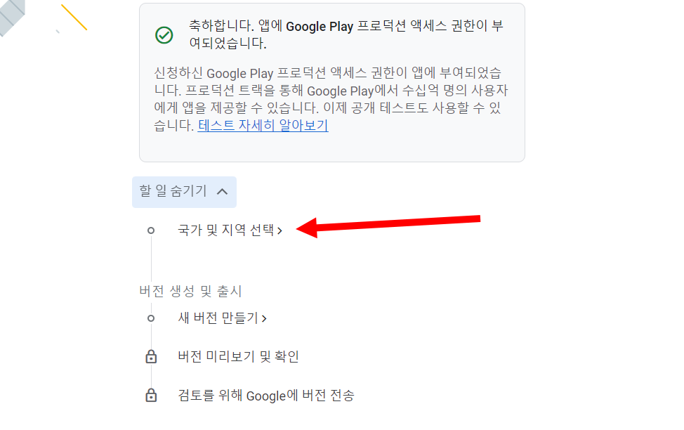 축하합니다! 앱에 Google Play 프로덕션 액세스 권한이 부여되었습니다.