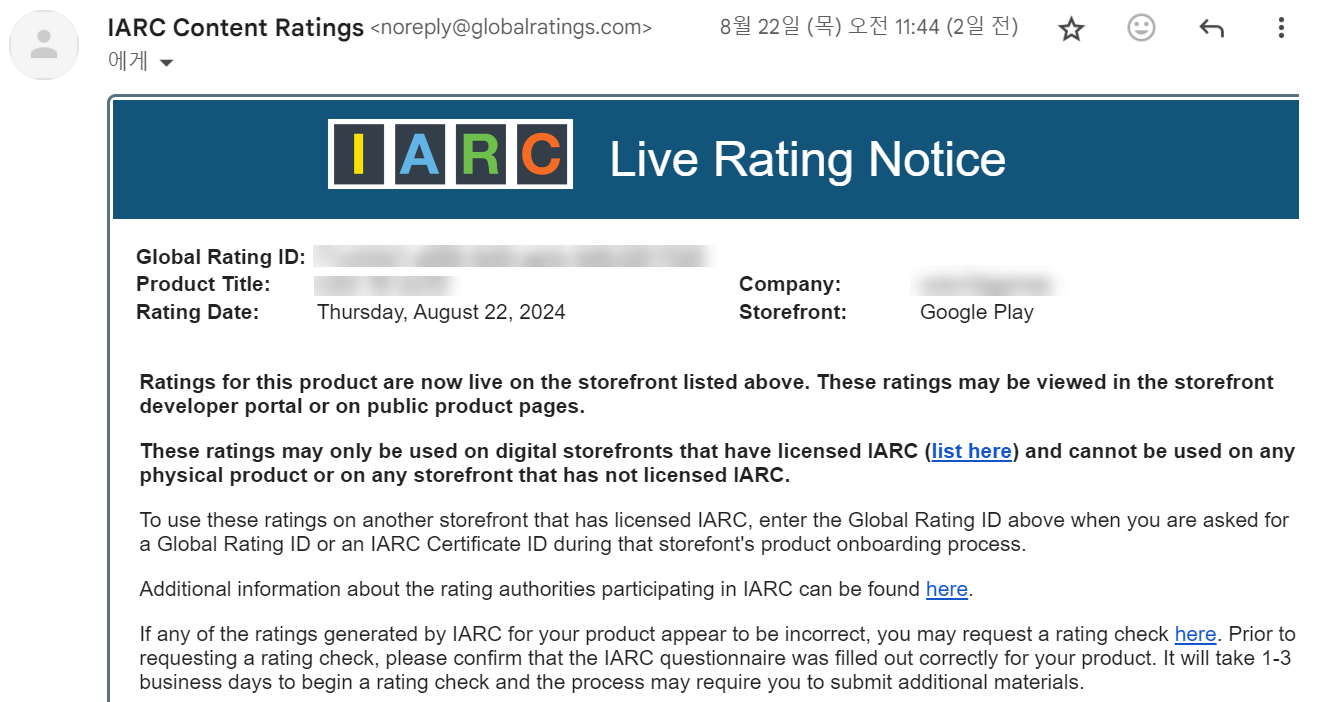 14)검토가 완료되어 앱이 출시되면 IARC Content Ratings(IARC 라이브 등급 공지) 이메일을 확인할수있습니다.