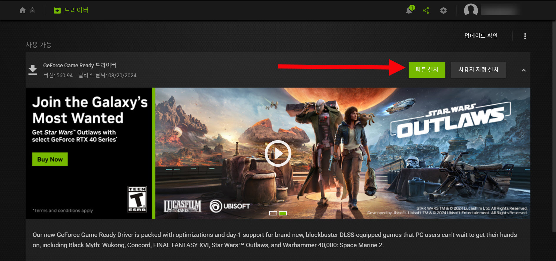 2)좌측 상단의 드라이버를 선택하고 업데이트 및 사용 가능한 드라이버를 확인합니다(드라이버 버전 560.94)