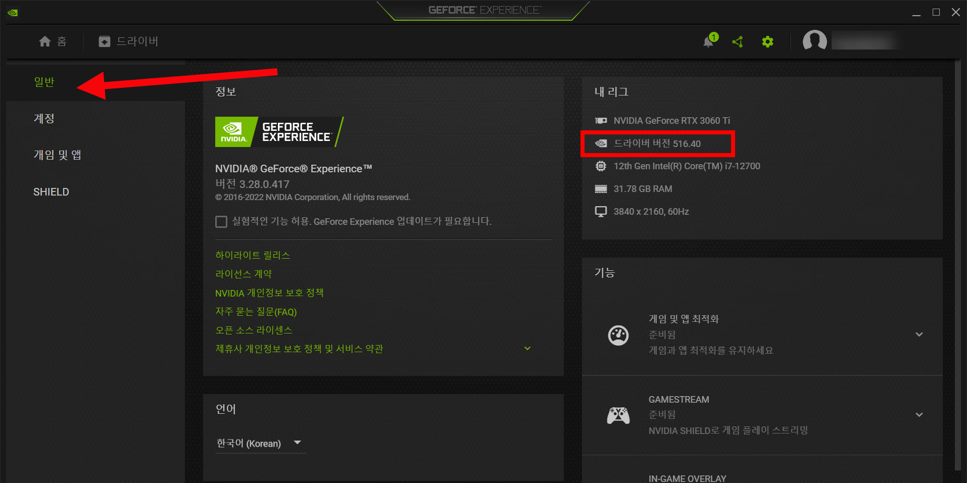 1)엔비디아 지포스(NVDIA GeForce) Experience를 실행하고 로그인합니다. 일반 메뉴에서 현재 PC에 설치된 드라이버 버전을 확인할수있습니다(드라이버 버전 516.40)