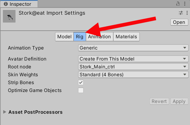 2)모델을 선택하고 가져오기 설정(import settings)에서 Rig를 선택합니다.