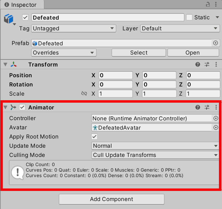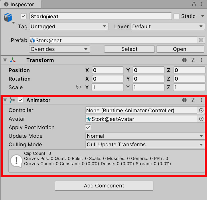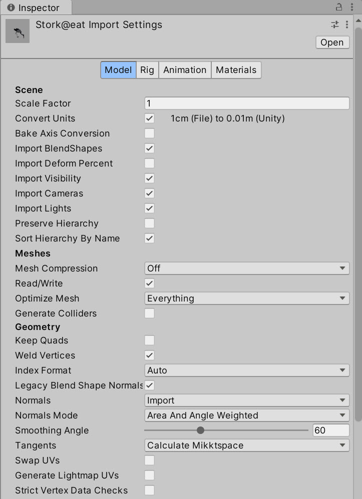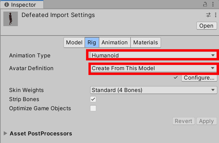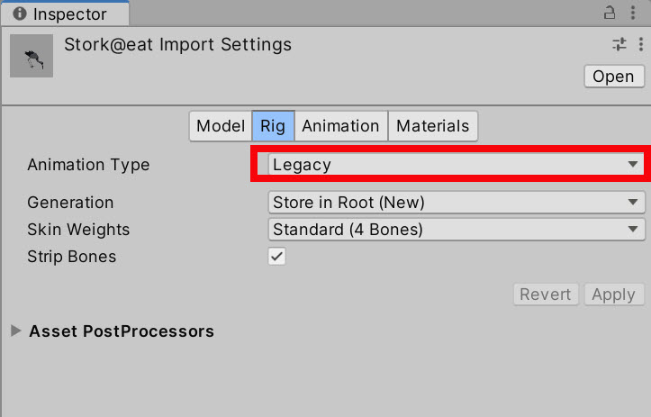 4)Legacy 유형은 해당 모델이 Unity 3.x 및 이전 버전의 레거시 애니메이션 시스템을 사용하도록 설정합니다. 특별한 경우(레거시 애니메이션 및 코드를 사용하는 경우) 사용될수있지만 이후에 단계적으로 지원되지않을 계획입니다.