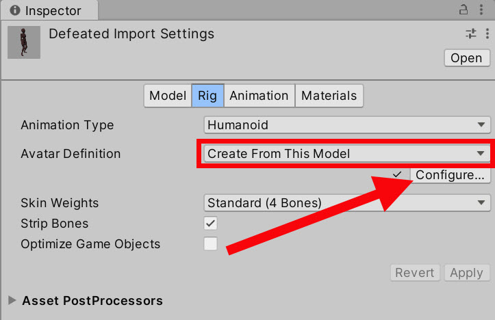 10)아바타 정의(Avatar Definition)에 Create From This Model을 선택하고 적용하면 유니티가 자동으로 휴머노이드 애니메이션을 리타게팅하며 configure에서 맵핑된 아바타를 확인할수있습니다.